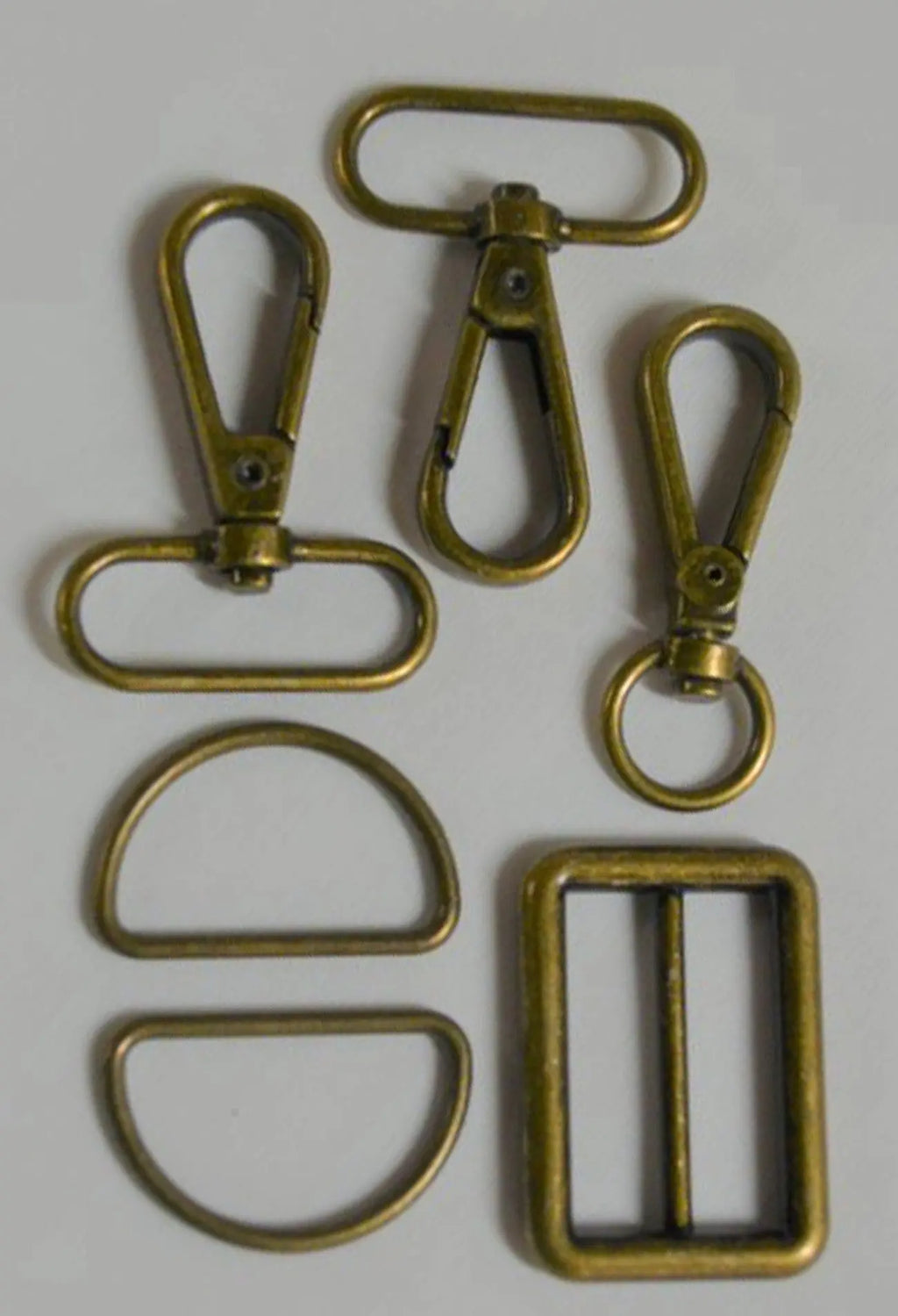 This bag strap hardware fits your 1-1/4in bag straps. This set comes with two swivel clips, two D-rings, one slider to make the strap adjustable, and one key fob swivel clip. This hardware set is the perfect companion for Pam Damour's conceal & carry Hold Everything Bag from her book of the same name.