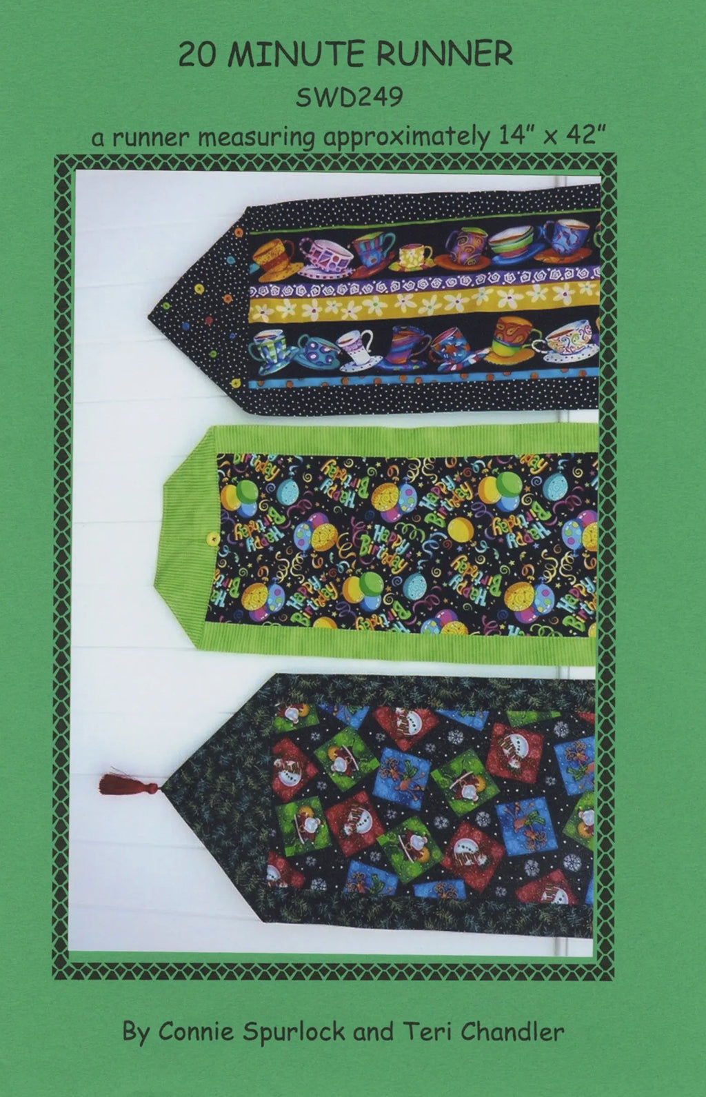 This delightful table runner kit, perfect for both quick home decor projects and gifts, measures 14 inches by 42 inches. Designed for efficiency, it can be completed in just 20 minutes, featuring three distinct designs. One showcases a charming array of teapots and teacups on a striped background, another displays a vibrant mix of colorful polka dots, and the third features playful snowmen and festive elements, all bordered with green fabric. Ideal for adding a touch of personality to your dining table or as a thoughtful handmade present, this runner is crafted by Connie Spurlock and Teri Chandler. The kit includes all necessary supplies: 1/3 yard of fabric for the center theme, 1/2 yard for the backing and border, and the option to add buttons or other embellishments for personalization.