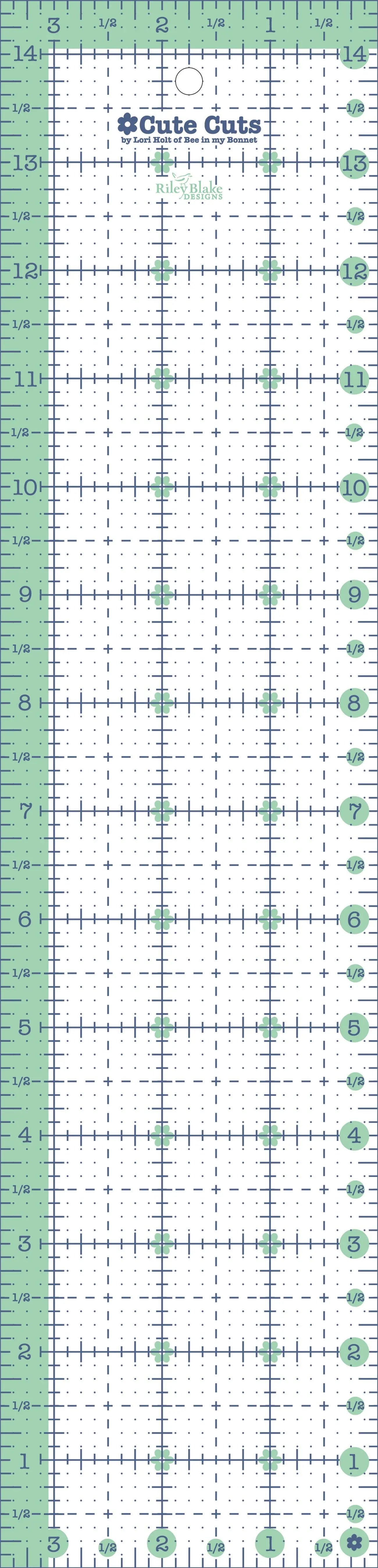 The Cute Cuts Rulers by Lori Holt of Bee in my Bonnet are non-slip and easy to read for extreme accuracy when cutting. The ruler has sweet mint and denim markings printed in 1in grids marked in 1/8in and 1/4in increments.