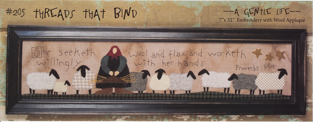 Features: Woman with sheep, embroidered text from Proverbs 31:13
