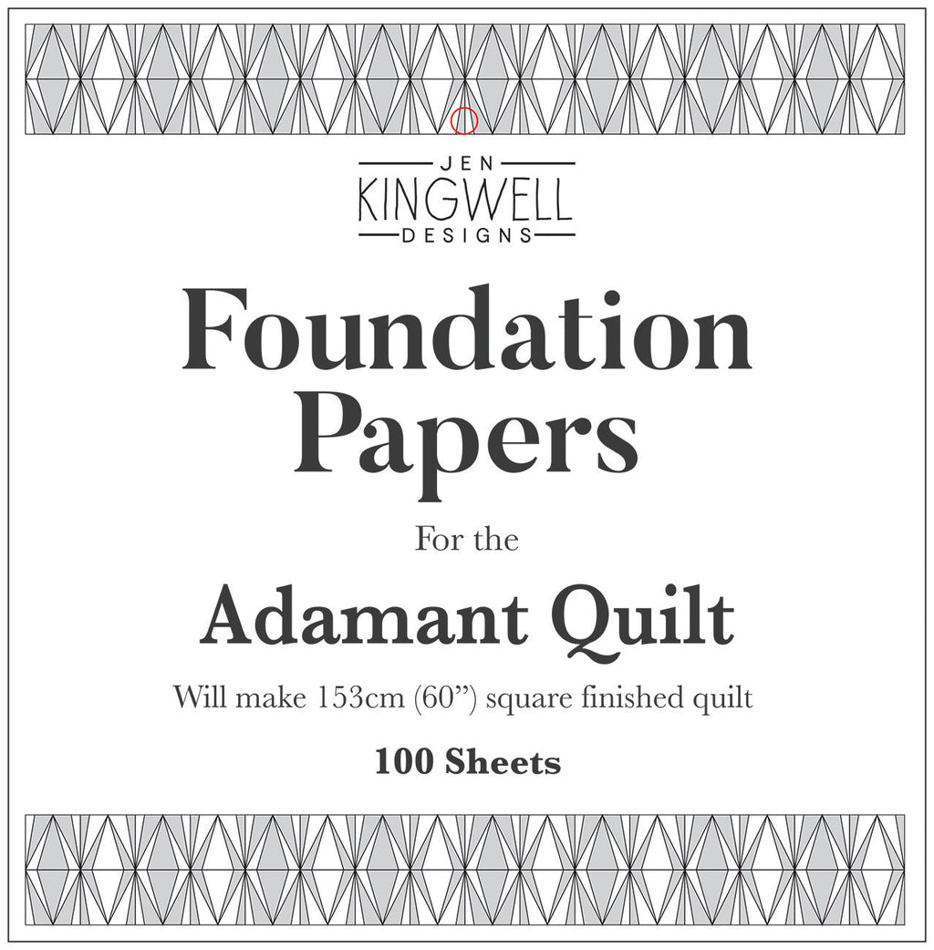 Adamant Foundation Papers By Jen Kingwell. Foundation Paper Only. Finished Block Measures 6" x 12” (6 ½" x 12 ½” including seam allowance). Adamant is the original Greek word for diamond meaning "unconquerable and untameable," which felt perfect when naming this fun block. These papers make this block both easy to conquer and very much tameable although the affect is anything but, coming together to create an amazing secondary pattern. Foundation papers for machine; a great stash buster. Will make finished quilt 60" square.