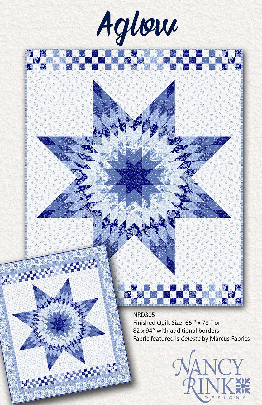 66 x 78" and 82 x 94" quilt options featuring the Celeste collection by Nancy Rink for Marcus Fabrics. Class Lone Star Blue and White.