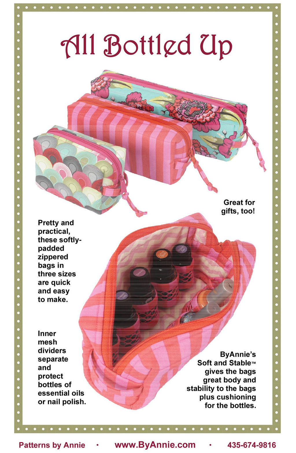 All Bottled Up: Pretty and practical, these softly-padded zippered bags with side loop handles are quick and easy to make. ByAnnie’s Soft and Stable gives them great body and stability. Mesh dividers separate and protect essential oils or nail polish in bottles from 5 to 15 ml and up to 3-1/2in tall. Additional space down the middle can be used for more bottles or other supplies. Instructions included for bags in three sizes: small (with mesh dividers for 6 bottles), medium (10 bottles), large (14 bottles). If you prefer, you may skip the inner dividers and use the cases to carry cosmetics, pens and pencils, school supplies, and more. Quick and easy to make, these cases are perfect for gift-giving, too! Uses Annie's Handbag zippers (PBAZIP24-color, PBAZIP30-color, PBAZIP40-color, PBAZIPYD-color