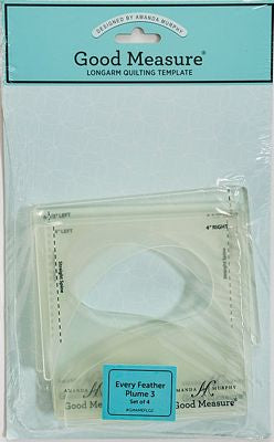 Amanda Murphy 1/4in (6mm) Every Feather Plume DescriptionAmanda Murphy’s Longarm Quilting Templates feature a special nonslip back and clear marking in two colors. With generous surface area, you’ll find them easier to hold. Their design makes them easy to read! The longarm thickness Every Feather Plume 2, set of four rulers gives you creative freedom. With 2 different sizes that quilt feathers approximately 4” and 4 ½” wide, quilting individual feathers or a feather border will be fast and easy. The possibilities are endless! Lower those feed dogs and get quilting!