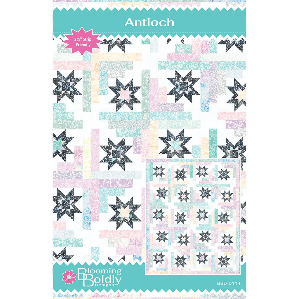 The Antioch quilt pattern by Leslie Ryan of Blooming Boldly Designs is 2.5" strip friendly and features star in a star blocks with log cabin corners. Traditional piecing methods. Finished size is 60 1/2" x 74 1/2".