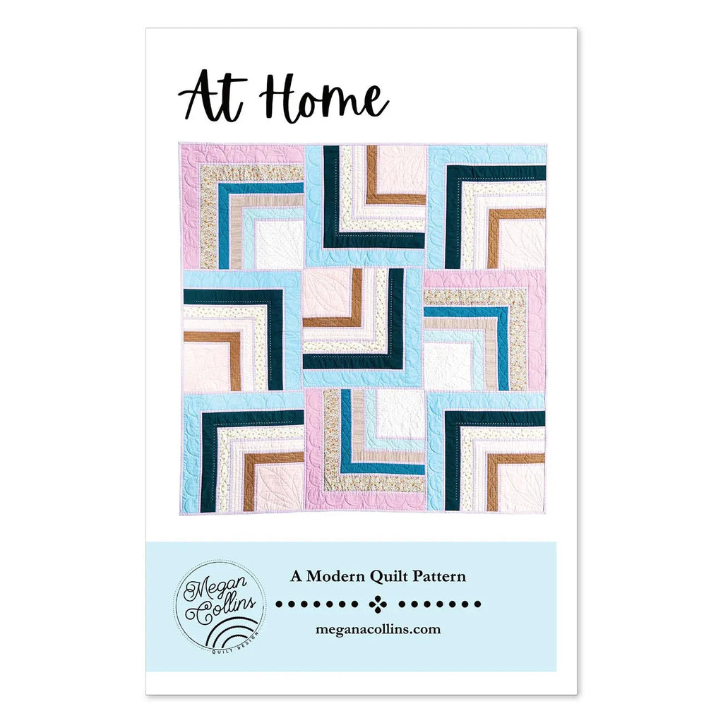 At Home is a modern interpretation of a traditional log cabin quilt. The varying widths of fabric and alternating half inch strips give this block a unique look. The extra-large blocks finish at 24" x 24". This pattern is a skill building pattern that focuses on length of fabric cutting and piecing long strips with accuracy and consistency. Baby (48" × 48"), Throw (72" × 72"), Twin (72" × 96"), Queen (96" × 96")