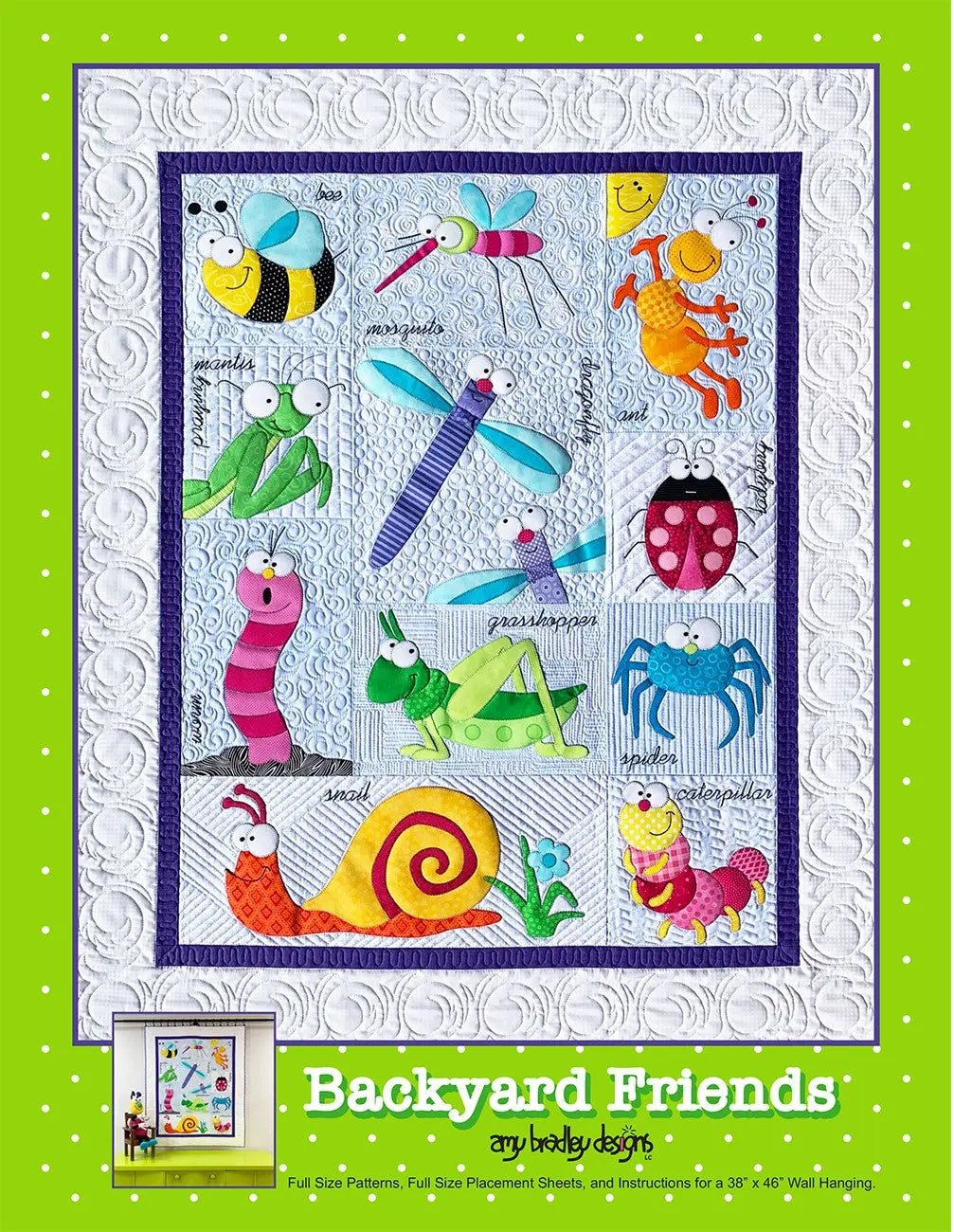 Backyard Friends quilt pattern includes full size patterns, placement sheets, and instructions to make this 38" x 46" wall hanging quilt. The technique is fusible applique.