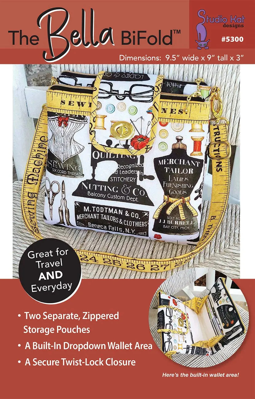 Bella BiFold: This bag pattern includes two separate zippered storage areas with a drop down wallet area in between them that allows you to leave that bulky wallet at home. The wallet area is securely closed with two invisible sew-in magnets AND a twist-lock closure on the Flap. It measures 9.5" wide X 9" tall X 3" and is perfect for everyday and for traveling.
