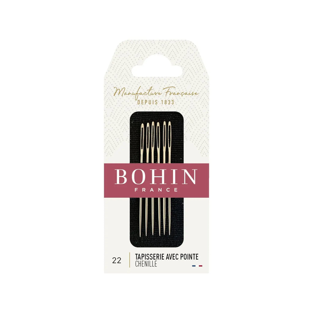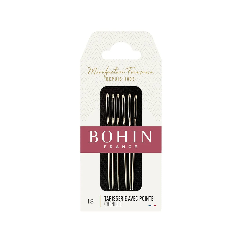 Pouch of 6 chenille needles, ideal for embroidery using a very thick yarn (silk chenille type) on thick canvases and fabrics. BOHIN chenille needles have a long eye that allows a thick yarn to be threaded through in order to make ribbon embroidery or embellishment embroidery, using very thick threads such as silk chenille. Made in France in Bohin factory, from nickel-plated steel, our needles go through 27 manufacturing stages, which guarantees an incomparable slide and an irreproachable tip.