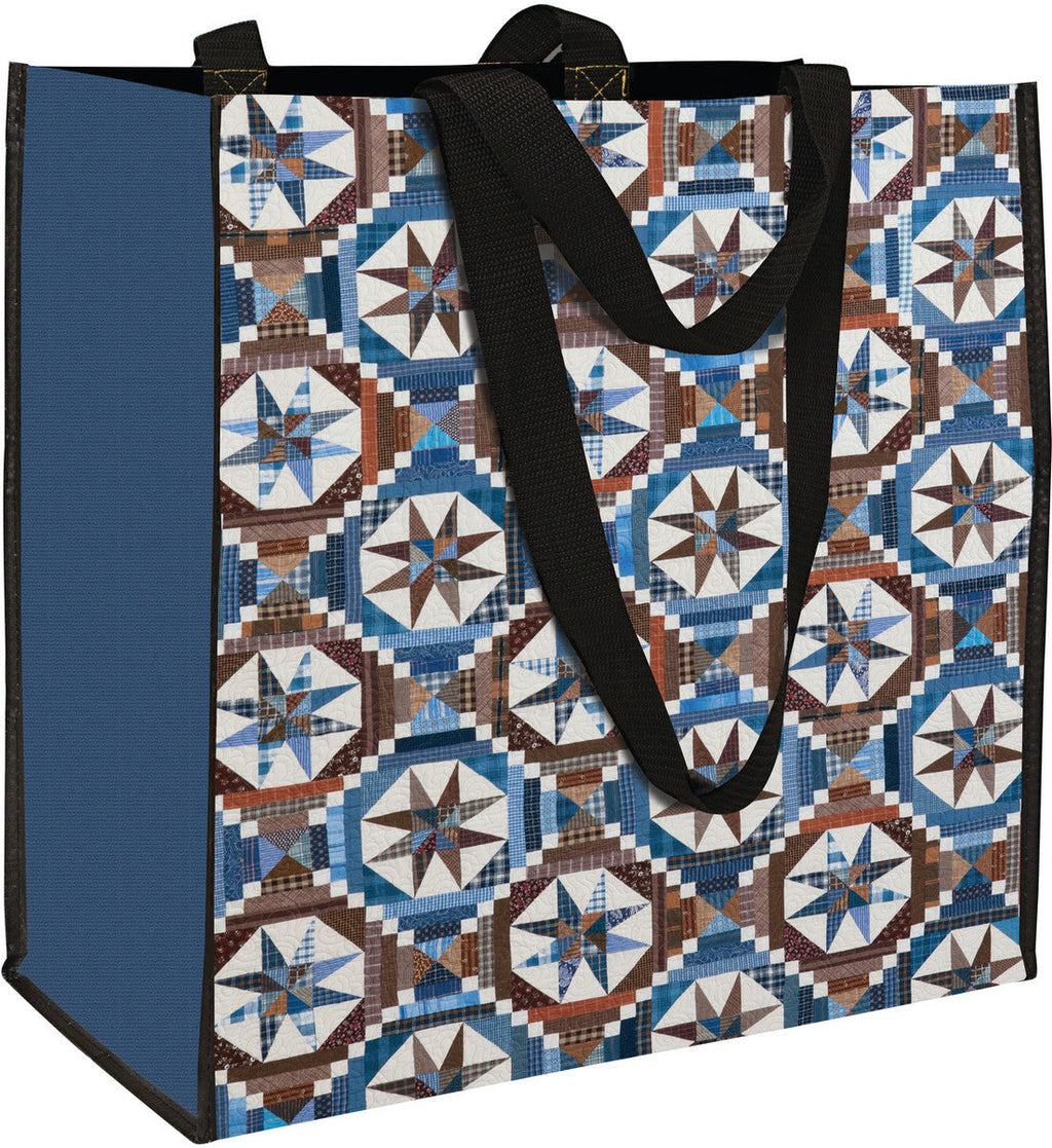 Cart your quilting fabric, books, groceries, and more in this sturdy and spacious bag that will become your new go-to carryall. It features the Smith Mountain Morning quilt from Scrap & Shirttails by internationally known and well-loved scrap quilter Bonnie K. Hunter. The environmentally conscious tote is made from recycled water bottles, also making it water-resistant. With double handles—one short, one long—you can carry it over your shoulder or on your arm as needed.
