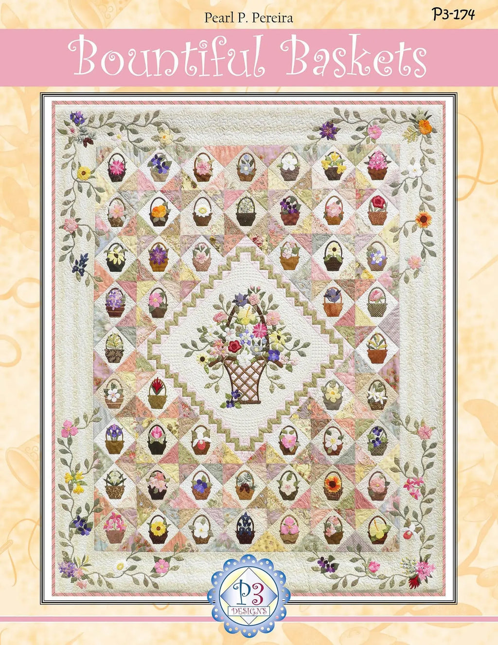 Bountiful Baskets Quilt: Finished quilt size 61" w x 75" H The Bountiful Basket quilt was designed as a scrap quilt to use all my treasured fabric scraps. I decided to have 5” basket blocks, with one flower representing each of the 50 states. The center medallion basket is point with alternating quarter square triangle blocks, and the small on point basket blocks. The pattern contains three 25” x 40” pattern sheets with full size drawings. Use your favorite applique method.