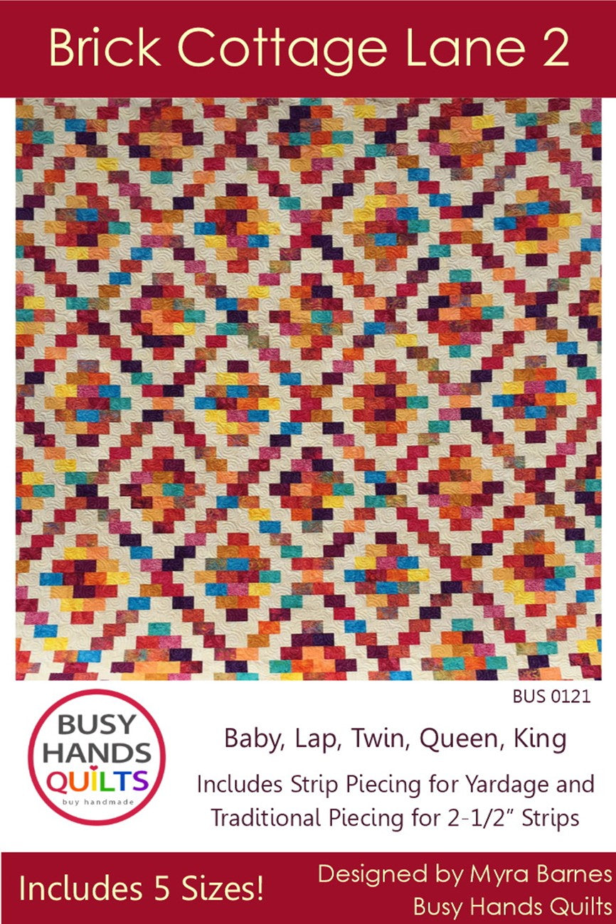 Brick Cottage Lane 2 is a stunning quilt pattern that includes 5 sizes – Baby 46” x 49”, Throw 58” x 70”, Twin 74” x 91”, Queen 98” x 98”, and King 106” x 98” - and is a versatile pattern that looks great in many fabric collections! Sweet pastels or bold, masculine prints are perfect for Brick Cottage Lane 2! The queen size is square, so the bricks can be oriented both vertically or horizontally. For all other quilt sizes, the bricks are oriented vertically. The joy of this pattern is that this pattern is entirely strip pieced, and you won’t be sewing together individual bricks unless you choose to! It would be extremely time-consuming to piece this quilt brick by brick - though not impossible. To save you incredible amounts of time and sanity, you will sew together strips of fabric into strip sets and then sub-cut segments from the strip sets. Then sew the segments together as shown in the pattern, and you have saved yourself BOAT LOADS of time. And that means you'll have time to make more quilts! :) You could, of course, cut a zillion bricks and sew them together one by one. The pattern also includes the traditional method of piecing this quilt, one brick at a time. This method allows 2-1/2" jelly roll strips to be used. Brick Cottage Lane 2 is suitable for advanced beginners and up. It has easy-to-follow, step-by-step instructions for cutting and piecing this stunning quilt. Previous knowledge of quilt top assembly, basting, quilting, and binding are assumed and are not taught in this pattern.