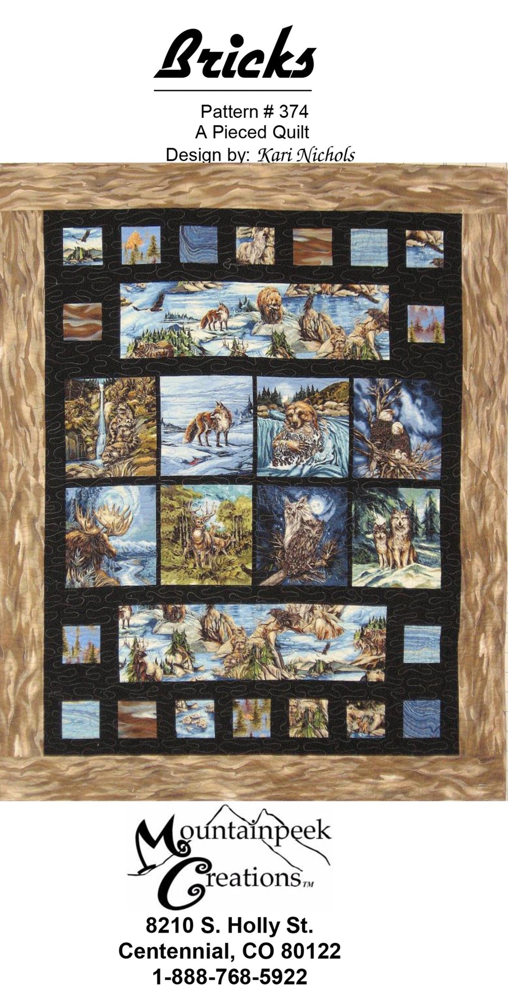 Discover the enchanting 'Bricks' quilt pattern, a piece of art designed by Kari Michaelis, which brings together a series of nature-inspired scenes. This quilt, with its finished size of 54.5 inches by 68.5 inches, features a captivating layout of panels depicting wildlife in serene landscapes, framed by a rustic wooden border. The design includes a mix of center panels or theme fabric, directional width of fabric, top and bottom accent fabric, sashing, bricks, outer border, binding, and backing, all contributing to a harmonious blend of colors and textures. Perfect for both personal use and as a unique gift, this quilt pattern from Mountainpeek Creations invites you to bring the tranquility of nature into your home.