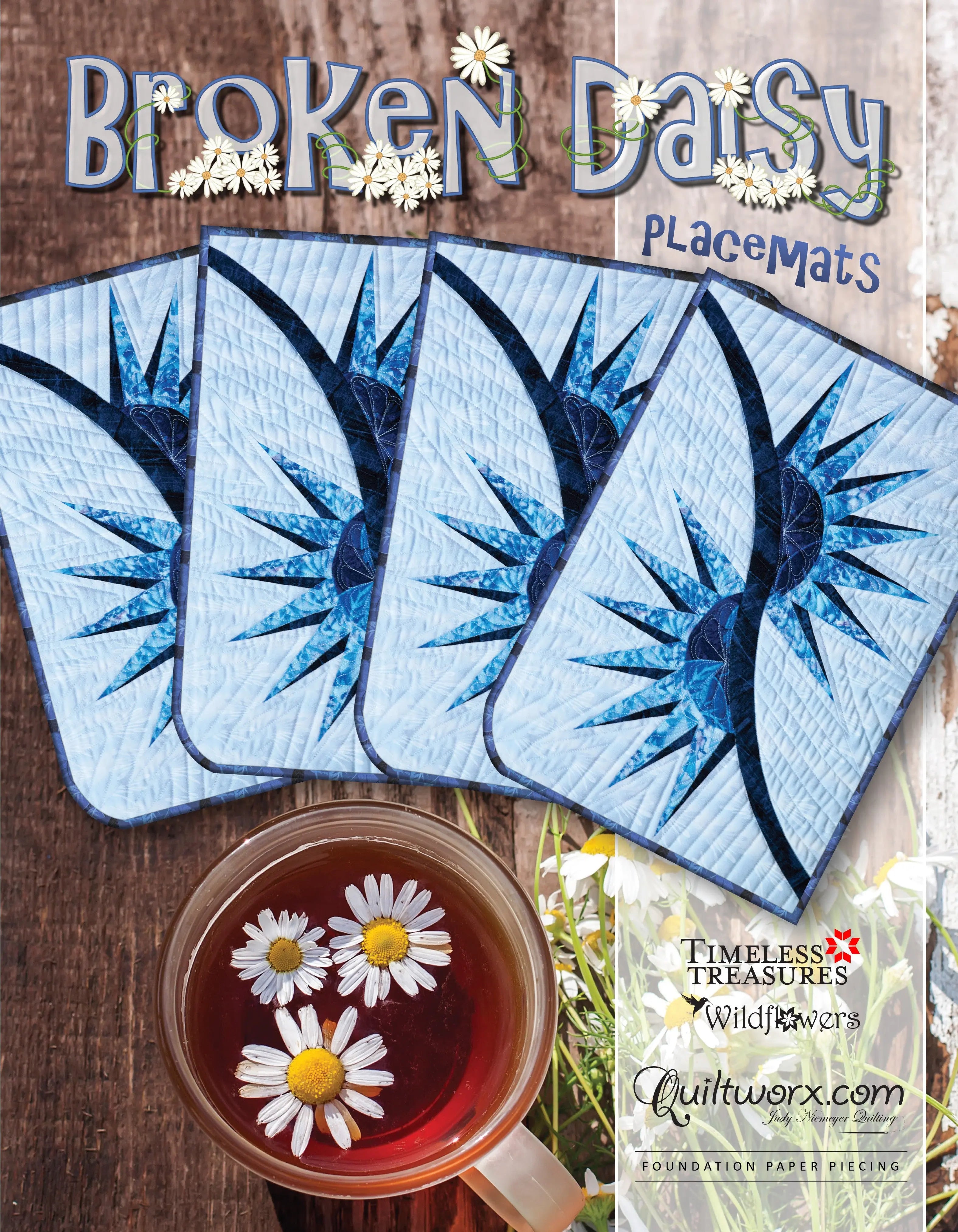 Broken Daisy is a foundation paper pieced place mat. Pattern includes enough foundation papers to make 4 place mats. Size 14in x 17in