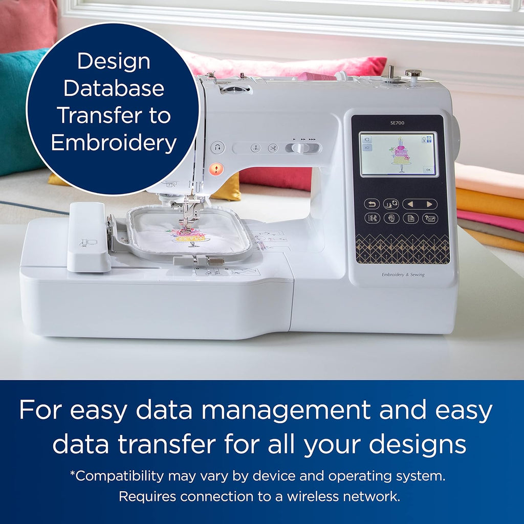 The Brother SE700 is equipped with Wireless LAN connectivity, allowing you to transfer embroidery designs wirelessly without the need for USBs. This feature enables seamless integration with Design Database Transfer, a free downloadable software that lets you send designs from your PC directly to the machine. Wireless LAN connectivity simplifies your workflow by eliminating physical connections and allowing for quick, convenient data transfers. Whether you're working on custom designs or using Brother's vast design libraries, the wireless capability of the SE700 ensures that your creative process is more flexible, efficient, and tech-friendly.
