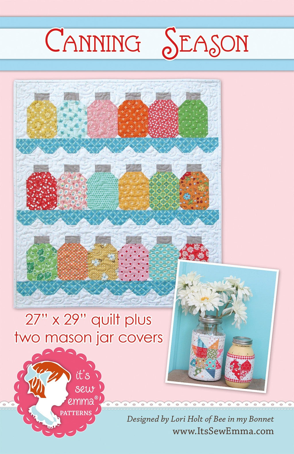 Perfect for those who have a farm-style or country kitchen, this wall Hanging quilt features canning jars sitting on shelves that have been lined with Scallop edge scarves. Each of the jars is composed of a different fabric so it's perfect for using up some of your scraps.27" x 29". Plus two mason jar covers.