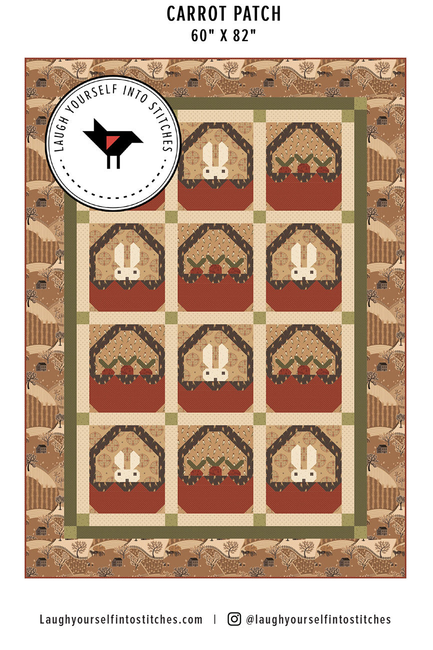 This sweet little bunny jumps from basket to basket devouring carrots! He's a bit concerned someone might catch him, so he peaks over the basket rim making sure no one is the wiser. The border fabric displays rolling fields just right for our little friend to grab a meal or two while barn swallows keep a look out. All traditionally pieced with no special templates required. Carrot Patch...'a bunny's best friend' measures 60" x 82". Intermediate Level.
