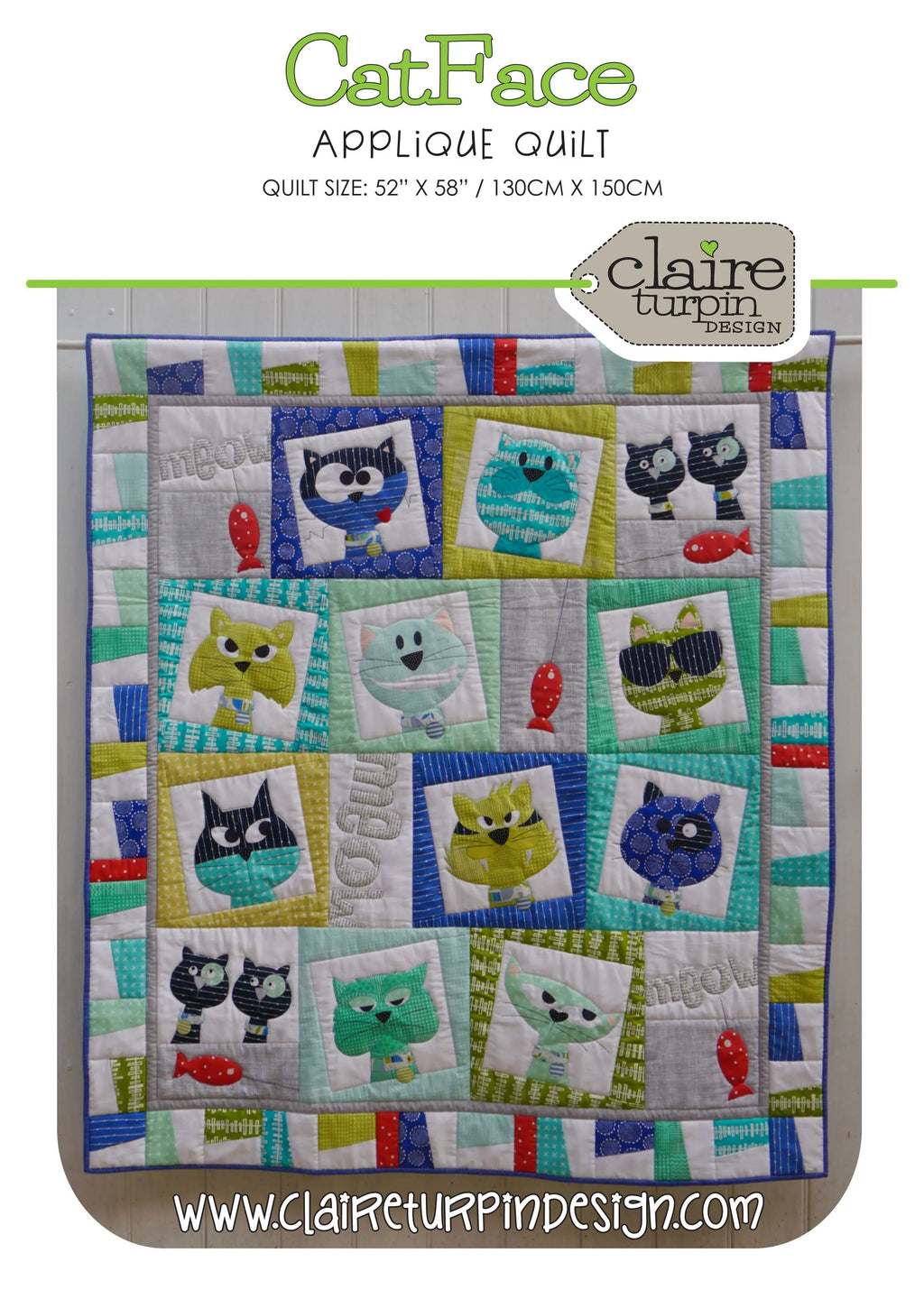 Catface Applique quilt pattern by Claire Turpin Designs features lots of different Cat faces, Which one is your favourite? QUILT SIZE: 52” X 58 ” / 130CM X 150CM