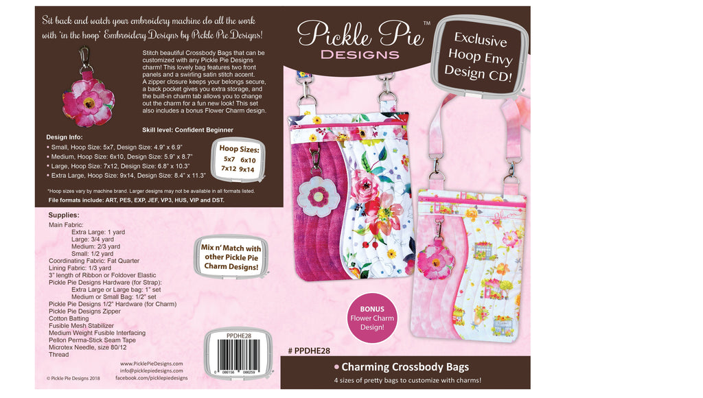 Stitch beautiful Crossbody Bags that can be customized with any Pickle Pie Designs charm or fob! This lovely bag features two front panels and a swirling satin stitch accent.