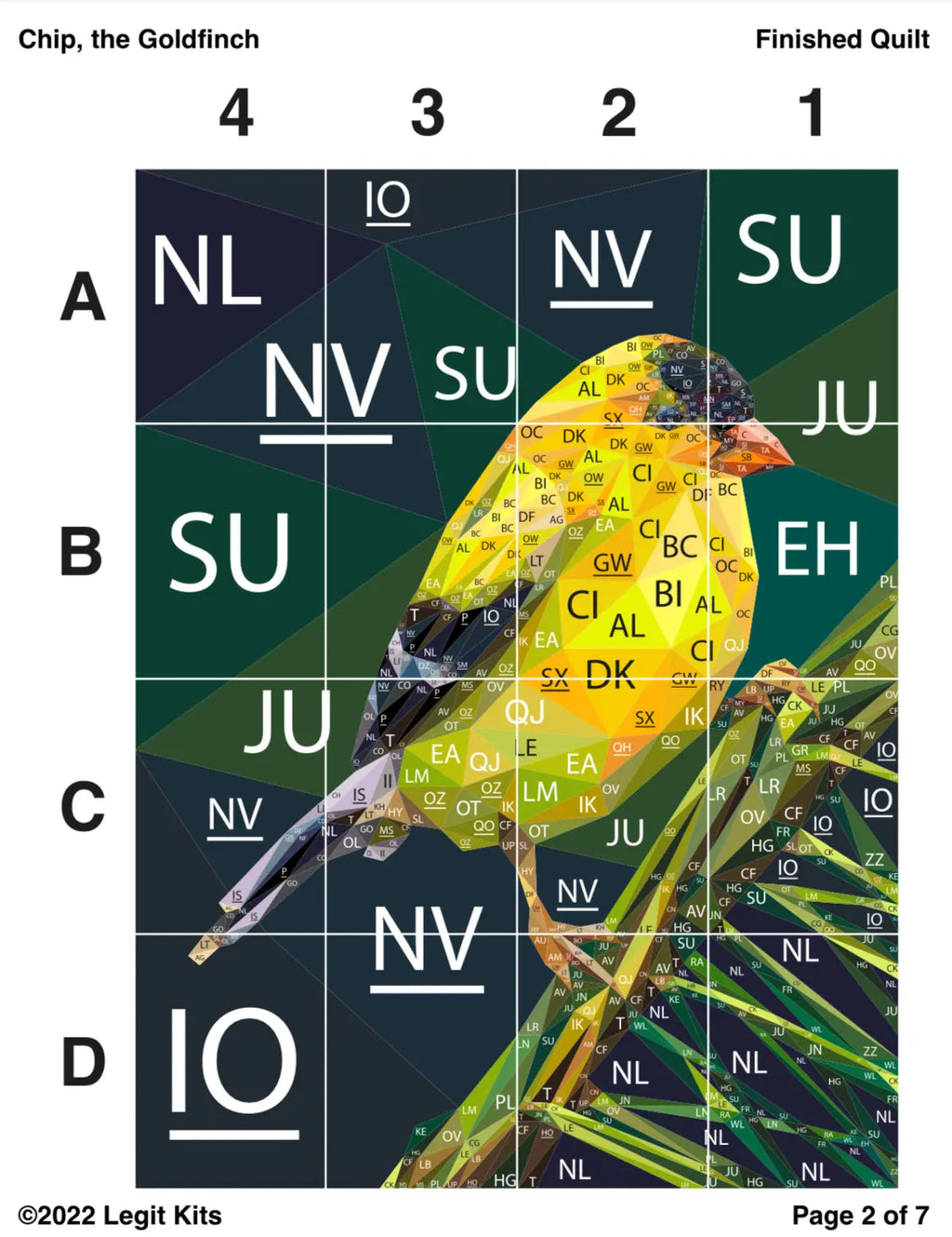 Chip the Goldfinch is a premium design with everything a foundation paper piece quilter could want. Designed with bright yellows and lush greens, this quilt top kit will make a fabulous wall hanging art piece, baby quilt, or surround this design with complimentary fabric to create a stunning full sized quilt top. This kit contains color maps, fabric lists, an assembly guide, the full pattern printed on foundation paper, and clearly labeled, ample cuts of 83 different shades of Robert Kaufman Kona Cotton Solids to complete this medium sized, 30 inch wide by 40 inch long quilt top.