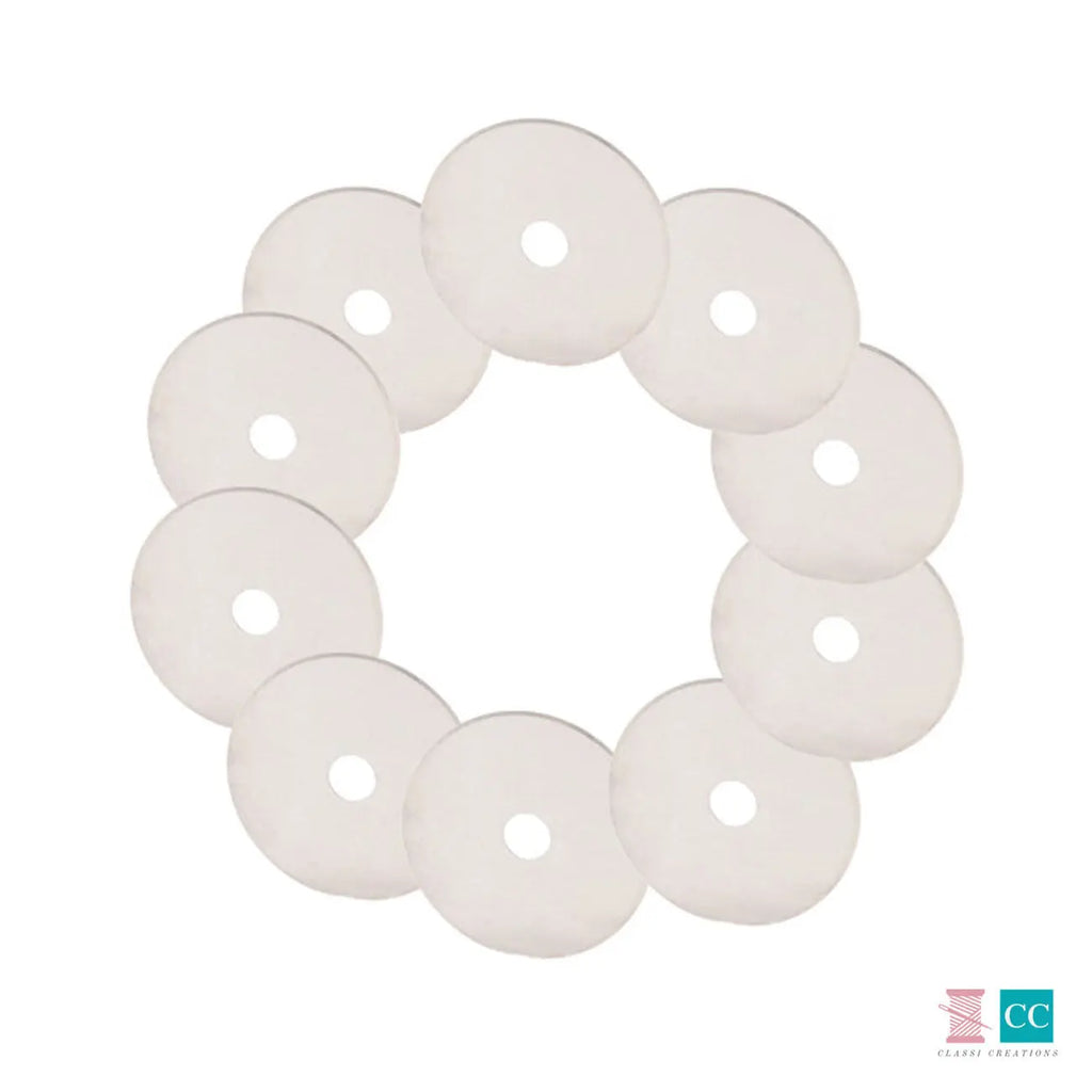 Material High Carbon Hitachi Steel Our premium 45mm rotary quilting blades crafted from high-grade Hitachi steel, designed to elevate your quilting experience to new heights. With razor-sharp precision and durability, these blades effortlessly glide through layers of fabric, ensuring clean, smooth cuts with every pass. Whether you're a seasoned quilter or just starting out, our blades promise reliability and longevity, making them an indispensable tool in your crafting arsenal. Upgrade your quilting game with blades that deliver unmatched performance and quality.