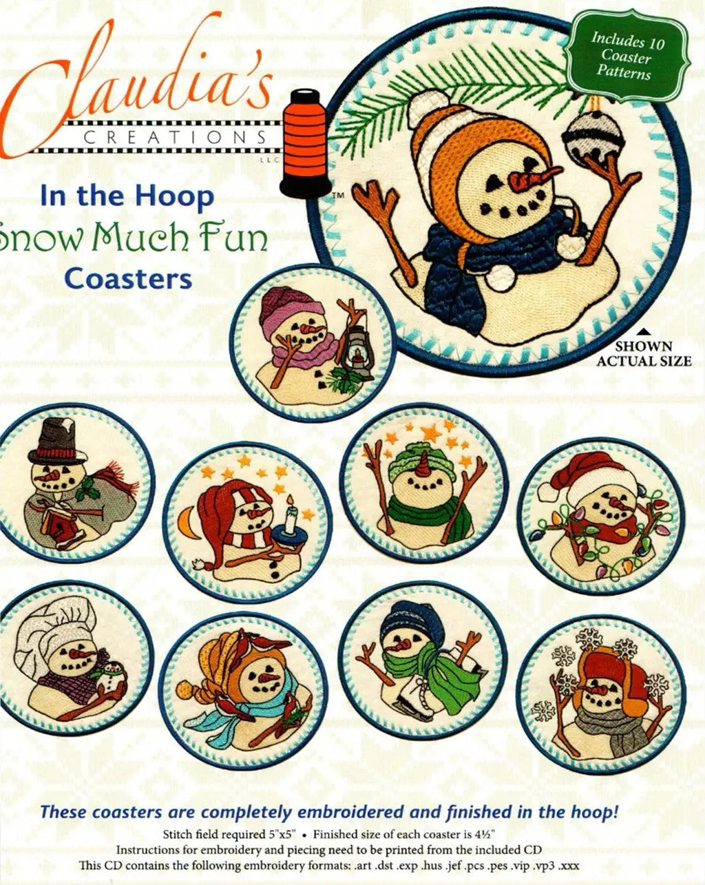 “In the Hoop” Snow Much Fun Coasters are completely embroidered and finished in the hoop. Coasters finish at 4½” round. There are 10 coaster designs in the following formats: .art .dst .exp .hus .jef .pcs .pes .vip .vp3 .xxx. Stitch field required 5” x 5” Instructions & designs come on a CD.