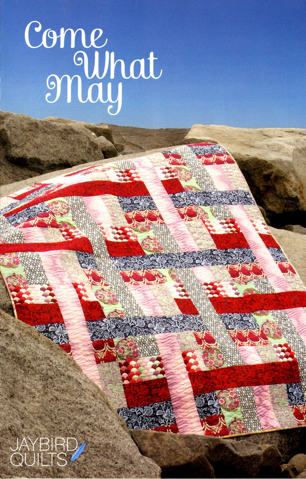 Come What May: Embrace the versatility of the "Come What May" quilt pattern, perfect for showcasing both small and large scale prints in a stunning design. This quilt, draped elegantly over rocks against a backdrop of a clear blue sky, features a vibrant mix of red, pink, and white fabrics with intricate patterns, creating a visually appealing contrast. Available in three sizes - Small (48in x 48in), Medium (64in x 80in), and Large (96in x 96in) - this pattern is ideal for any setting, from cozy personal spaces to larger, more communal areas. The detailed fabric selection includes a blend of stripes, florals, and geometric designs, ensuring a unique and beautiful appearance.