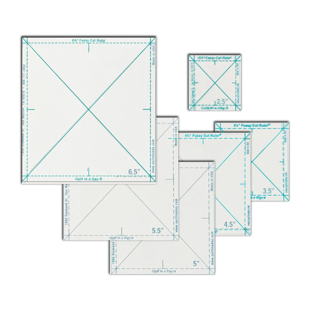 A fussy cut is a selected image, such as a flower, centered on your patch. With a Fussy Cut Ruler, you can cut the identical image from your fabric repeatedly with ease. The Complete Fussy Cut Ruler Set is a set of six laser precise heavy gauge plastic rulers in these sizes: 2-1/2in, 3-1/2in, 4-1/2in, 5in, 5-1/2in and 6-1/2in. Quarter inch lines are provided for seam allowances. Perfect places for Fussy Cuts are the center or four corners of your block, or the cornerstones of lattice. Fully illustrated and detailed instructions are included.