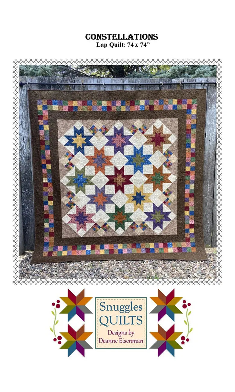 Charming star in a star, one block quilt that will use up your favorite color print fabrics. Easy to piece blocks accented with a colorful pieced border.