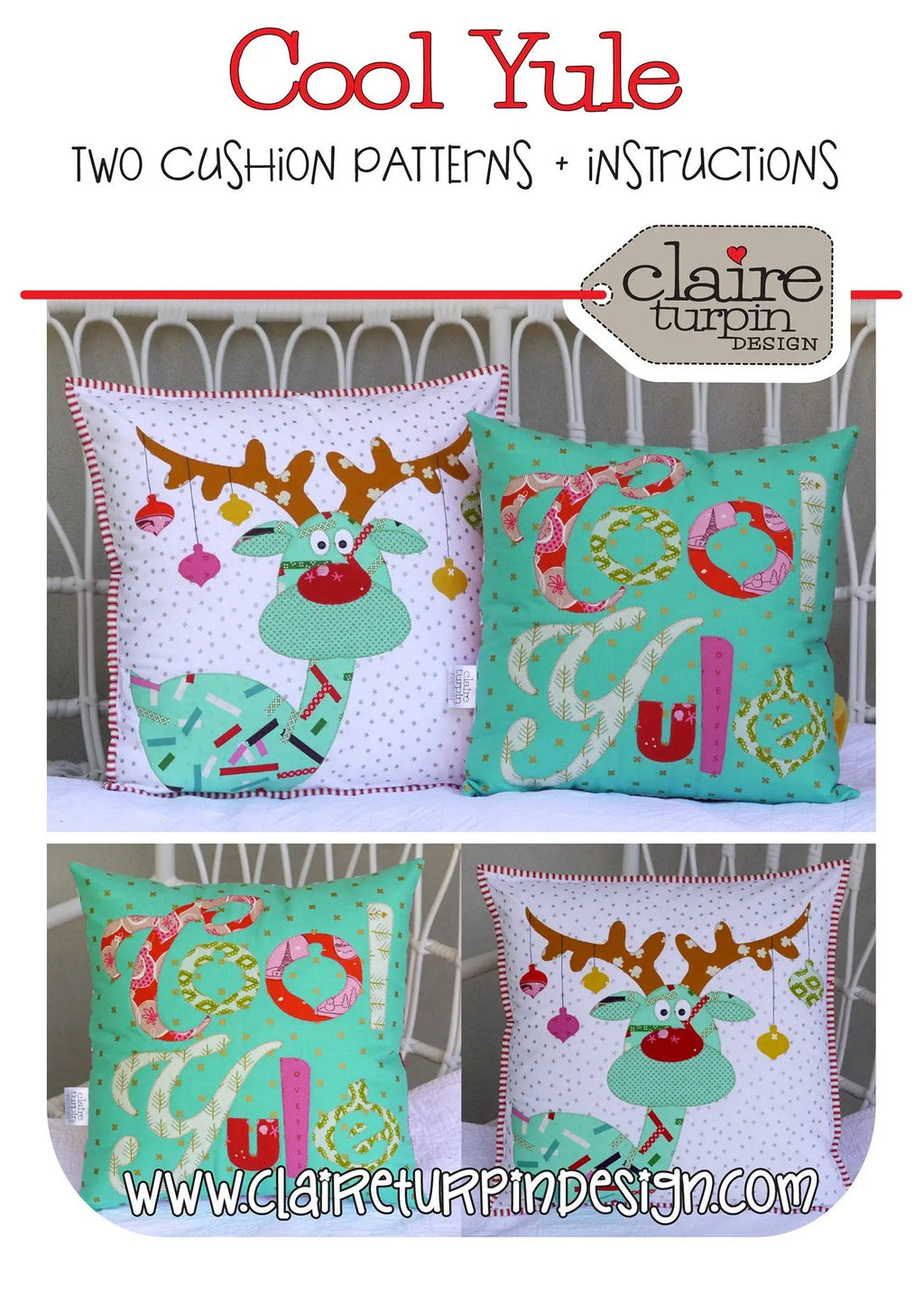 Two gorgeous applique Christmas CushionsReindeer Cushion size 18in squareCool Yule Cushion size 16in square Designed By Claire Turpin Design