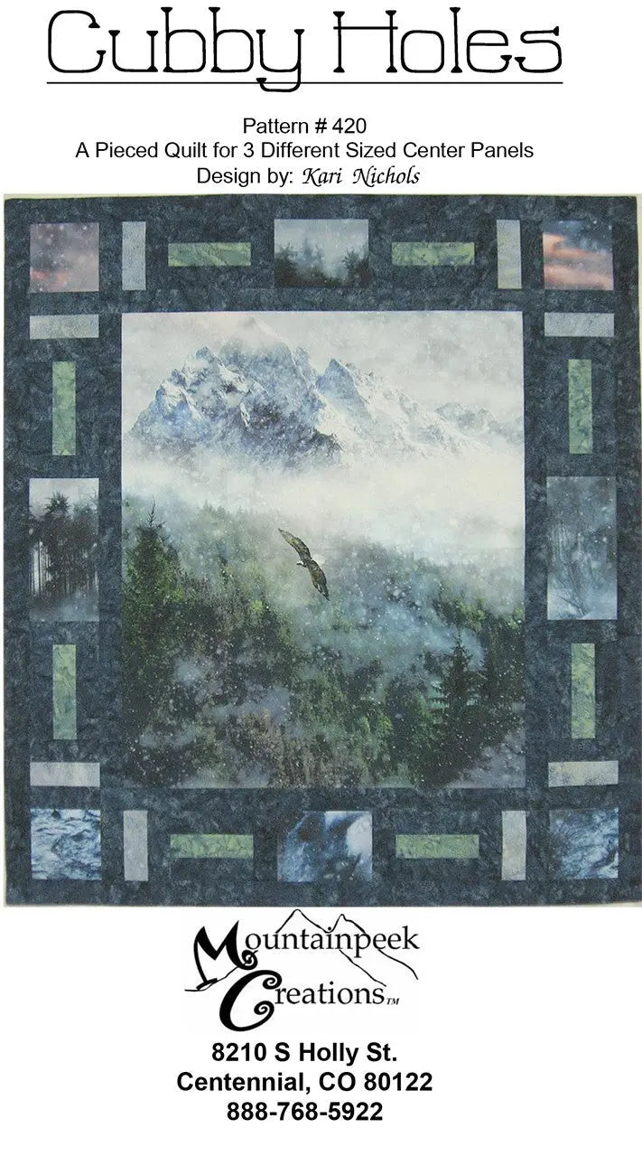Discover the serene beauty of nature with the Cubby Holes quilt pattern, designed to bring the tranquility of misty mountains and soaring eagles into your home. This quilt features a stunning central panel with a misty mountain landscape, framed by a border of smaller squares that echo the misty, green, and blue hues of the wilderness. Perfect for quilters looking to capture the essence of the great outdoors, this pattern provides detailed fabric requirements for various quilt sizes, ensuring a precise and beautiful finish.