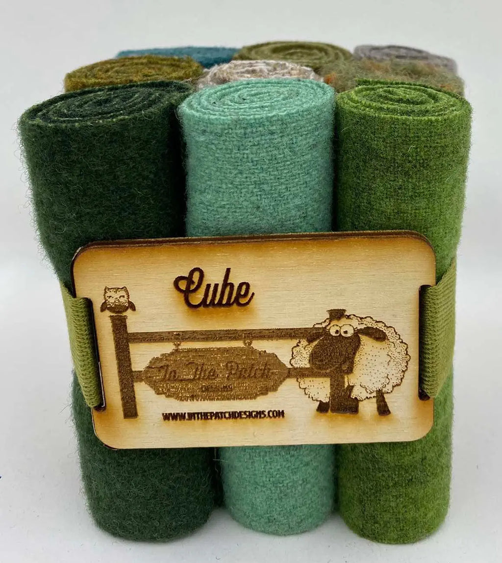 Curler Cube Mother Earth: Contains 9 assorted curlers that measure 4in x 16in each of hand dyed and mill dyed wools. All felted and ready to stitch or rug hook.