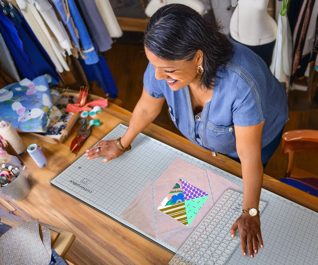 The Cutterpillar Flip & Fold 48 Self-Healing Cutting Mat is a revolutionary large-format cutting mat that uniquely folds down for easy storage and transport. Designed with a patented "puzzle-lock" system, it provides a seamless and smooth cutting surface when fully open at a massive 36" x 48", eliminating the common issue of warping associated with traditional large PVC mats.