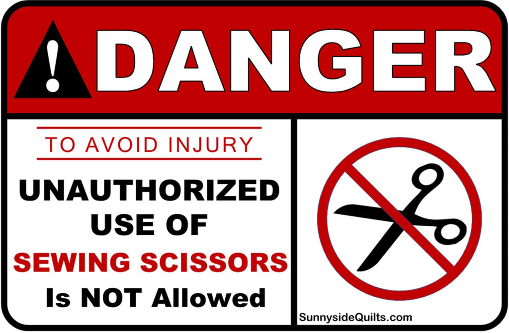 Warn your family and friends and let them know that they are NOT allowed to touch your sewing shears! This sign is a full color print with rounded corners on non-tearable 14 Mil Polyester Paper and is easy to hang on your sewing room door, wall, or bulletin board using the hole punched at the top or double-sided tape (not included). Design says: DANGER—To Avoid Injury Unauthorized Use of SEWING SCISSORS Is NOT Allowed