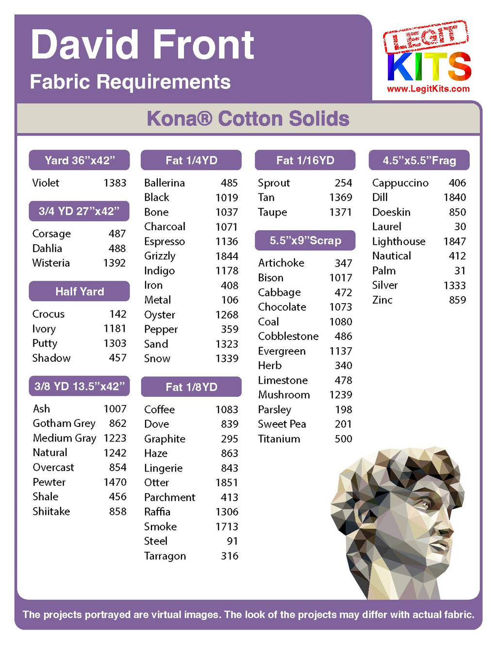 David Front captures the classic sculpture by Michelangelo using a powerful palette of colors, elegant shading, compelling imagery, and is a quilt that will dominate conversations. The fig leaf is optional and included in the kit.