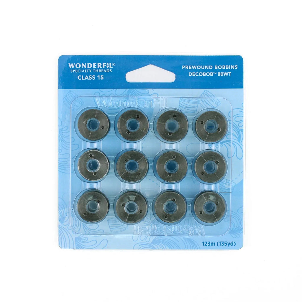 WonderFil pre-wound bobbins are wound with our 80wt DecoBob™ thread in a reusable plastic bobbin, which means there is no glue or wax holding it together (which also makes for happy machines)! DecoBob™ makes for an ideal bobbin thread as using a finer weight thread will also minimize the bulk in whatever you are doing, however DecoBob™ also has the strength, versatility, and reliability you can count on.