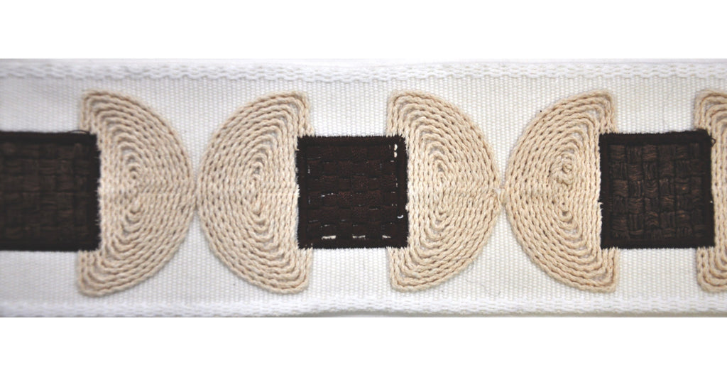 Woven Decorative Tape 3 inches wide BR-7353-24/06 Ivory and Brown, 25 yard roll. Used mainly for Drapes or Trimming edges of Products. Can only be dry cleaned and is used for drapes and pillows for a very attractive finish