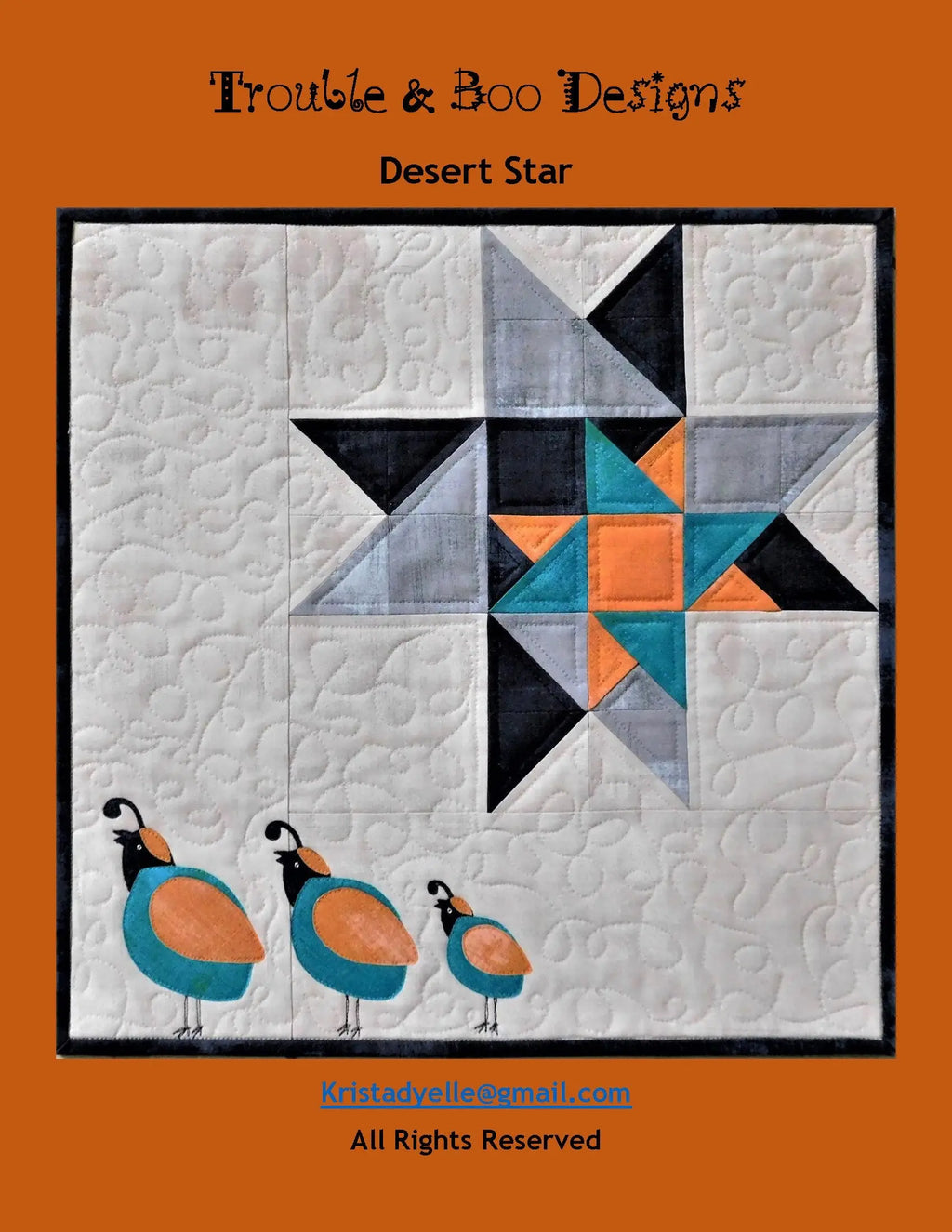 This wall hanging (approximately 17" square) has a little bit of everything - traditional piecing, paper or foundation piecing & raw edge, fused & machine stitched applique. The traditional star quilt block is pieced & paper pieced in the bright colors of the southwest. The star forms the background for the colorful quail in definitely nontraditional orange, grey & turquoise, stitched in applique. Embellished with seed beads.