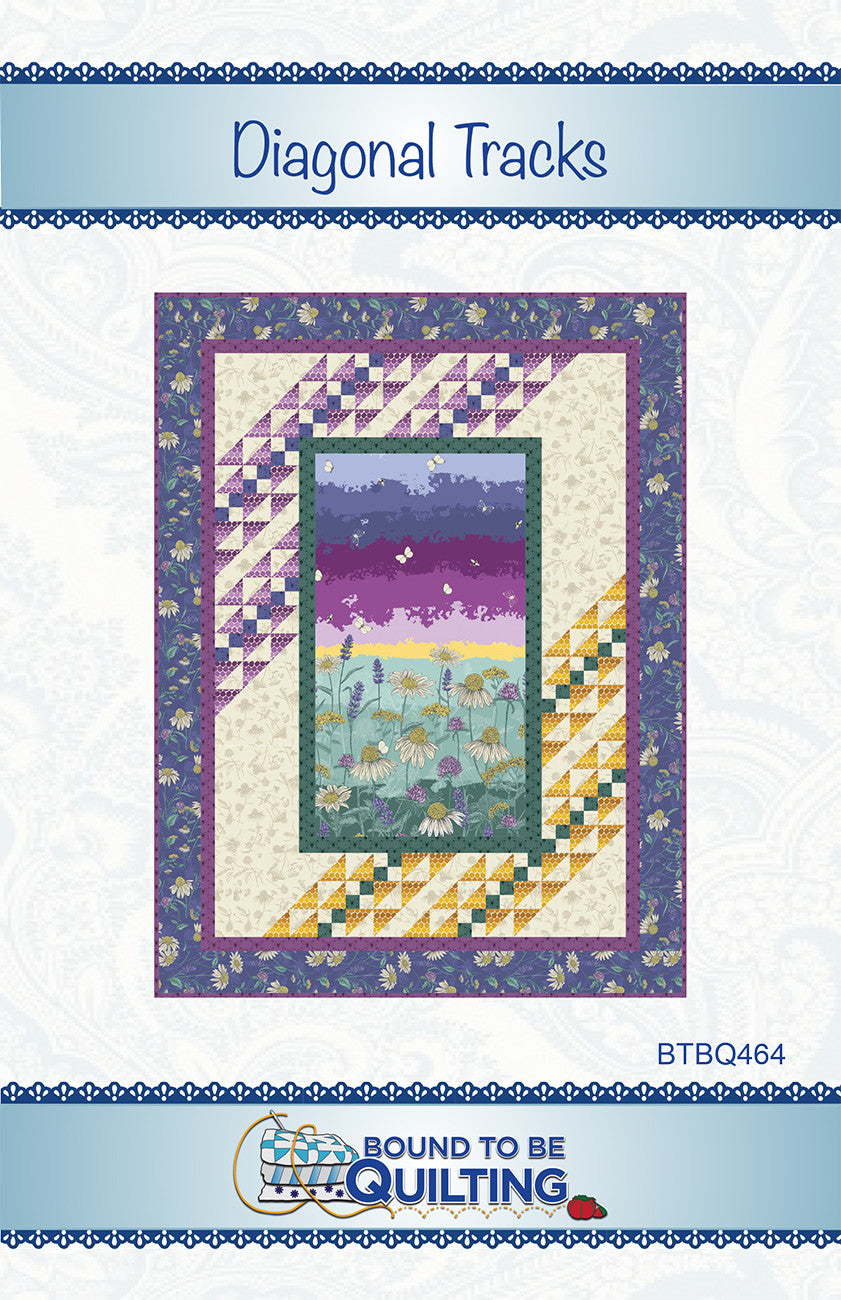 Diagonal Tracks: Chain Blocks make "tracks" across the corners of this beautiful floral panel (24") from the Bee Haven collection by Benartex. Finished size is 56" x 75". Skill level is confident beginner