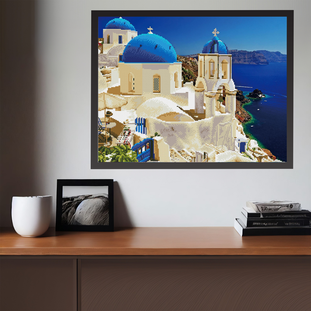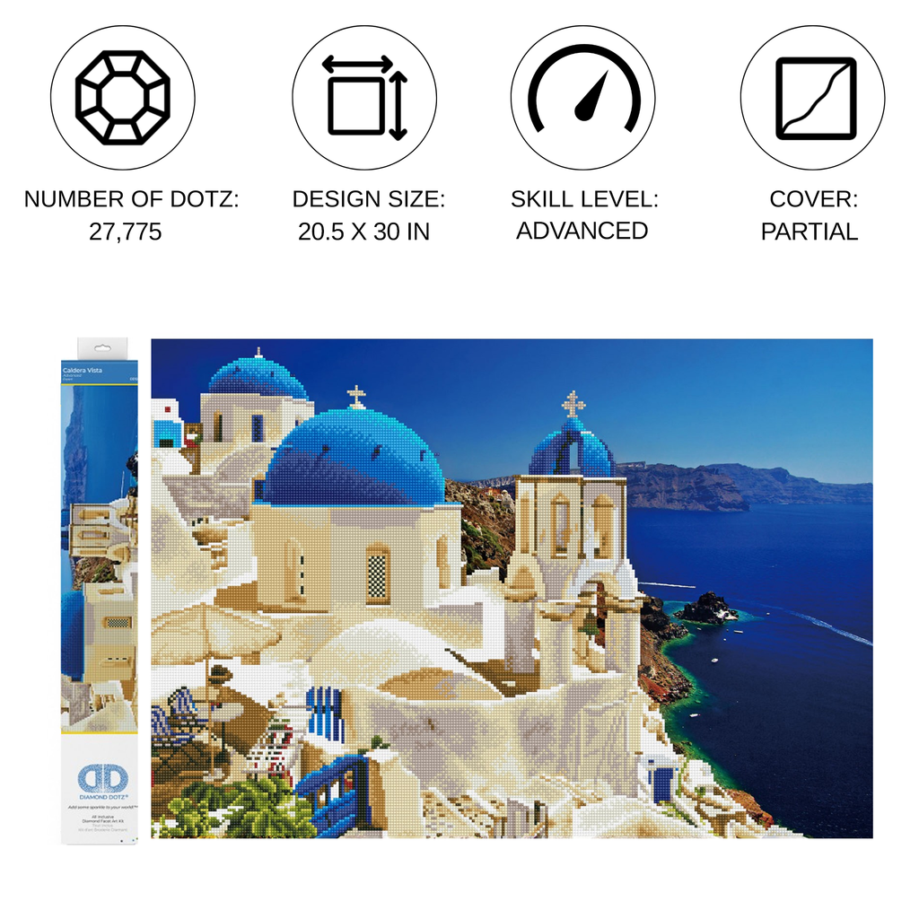 Escape to the Greek Isles with the Diamond Dotz Caldera Vista diamond painting landscape. This gorgeous view of Santorini features whitewashed buildings with iconic blue domes overlooking the Aegean Sea. Gentle cliffs and turquoise waters stretch to the horizon in this partial coverage Diamond Art Kit using round-shaped diamonds for sparkling accents. Perfect for those who enjoy Diamond Painting Kits for Adults Diamond Art Kits and sunlit coastal landscape diamond art.
