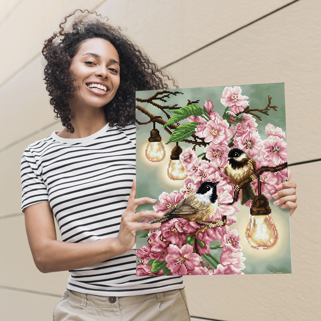Diamond Dotz Cherry Blossoms & Chickadees - 16.5" x 20.5": Cherry Blossoms & Chickadees is a peaceful scene of blooming pink cherry blossoms with sweet chickadees perched among the branches. This detailed floral diamond art is created with brilliant round-faceted diamonds and printed on full-drill fabric. A tranquil and eye-catching design in the Diamond Painting Kits for Adults series.