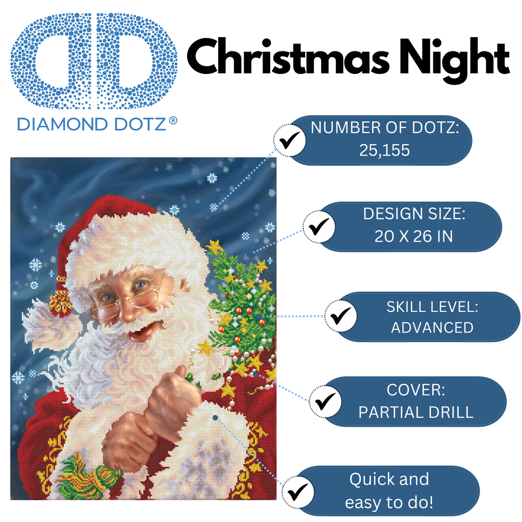 Celebrate the joy of the season with the Diamond Dotz Christmas Night kit - a jolly and detailed portrait of Santa Claus delivering Christmas cheer under a starry sky. This advanced-level project features 25 155 dazzling Dotz in Partial coverage offering brilliant highlights and lifelike shading across Santaโs cheerful expression cozy suit and twinkling tree. A must-have for seasoned crafters and holiday lovers this design adds festive sparkle to any collection of Diamond Painting Kits for Adults and premium Diamond Art Kits. Perfect for anyone seeking a heartwarming christmas diamond painting masterpiece.