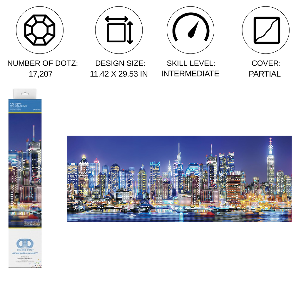 Diamond Dotz City Lights - 29.5" x 11.4": Light up your world with the Diamond Dotz City Lights diamond painting landscape. This vibrant skyline sparkles with skyscrapers reflections and color against a twilight backdrop. With partial coverage and round-shaped diamonds this Diamond Art Kit lets the skyline shine in all the right places. A brilliant choice for those who love Diamond Painting Kits for Adults Diamond Art Kits and metropolitan-style landscape diamond art.
