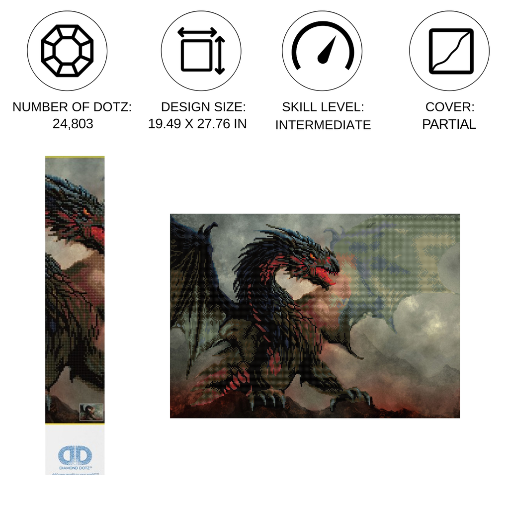 Diamond Dotz Dragon's Lair - 19.5" x 27.8": Step into a fiery realm with the Diamond Dotz Dragon’s Lair Diamond Painting Kit a stunning fantasy scene ideal for fans of mythical creatures and Diamond Painting Kits for Adults. This intricate design features a fierce black and red dragon looming over a smoky battlefield wings spread wide as it prepares to defend its territory. Whether you're a fantasy lover or collector of dragon diamond art this piece will become a fiery centerpiece in your collection.