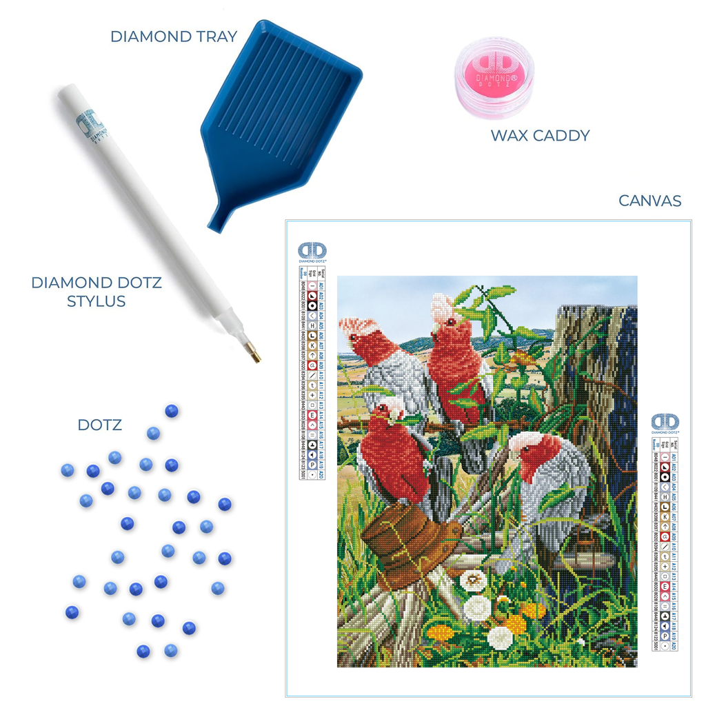 Galah Quartet by Diamond Dotz captures four cheerful galahs perched on rustic wooden posts surrounded by Australian countryside charm. With wildflowers blooming beneath them and vines twisting around the timber this scenic 25 786-dot kit features partial coverage and round-shaped dotz. A vibrant project for advanced crafters it highlights the natural beauty of birdlife in a storytelling setting. Keywords: Diamond Painting Kits for Adults Diamond Art Kits diamond art birds diamond painting birds bird diamond painting.