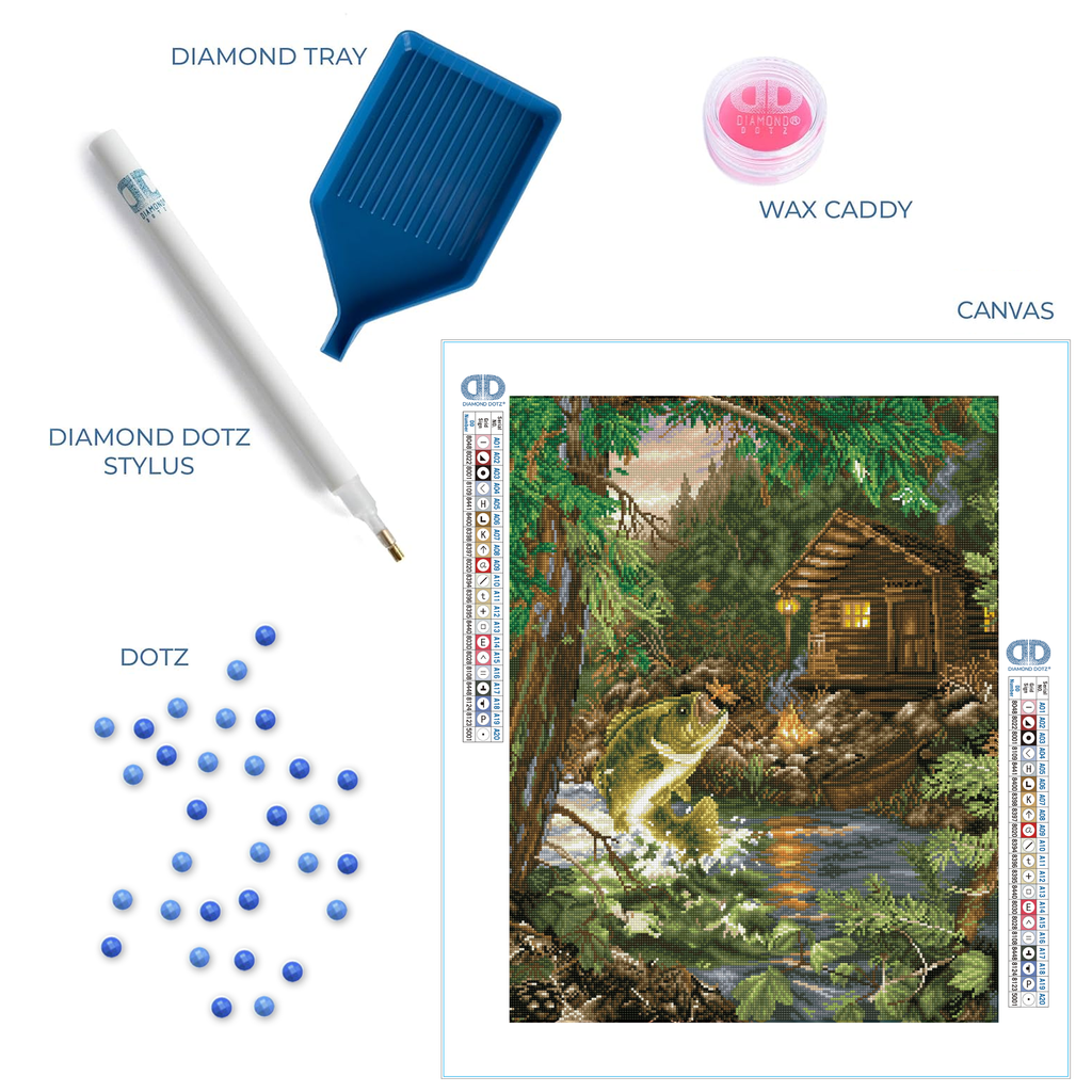 Capture a rustic lakeside escape with the Diamond Dotz Gone Fishing diamond painting kit. Designed by Dona Gelsinger this cozy cabin scene features a leaping bass frozen mid-splash in vivid detail framed by lush greenery and golden cabin light. A wonderful choice for nature lovers and fans of Diamond Painting Kits for Adults Diamond Art Kits and realistic diamond art fish pieces.