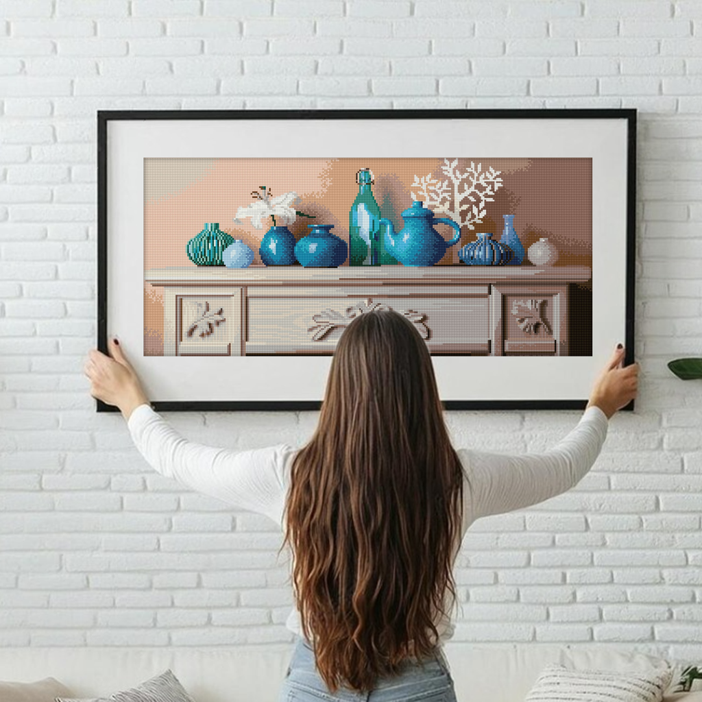 Transform your space with the soothing charm of “Home Decor ” a beautifully styled still life captured in rich calming hues. This diamond painting kit features an elegant shelf lined with ceramic vases bottles and florals in a palette of turquoise and ivory all brought to life with brilliant square Dotz. Perfect for crafters who love interior design this project adds a touch of peaceful sophistication to any room while offering the satisfaction of a creative challenge. A wonderful choice for those who enjoy Diamond Painting Kits for Adults and high-detail Diamond Art Kits.