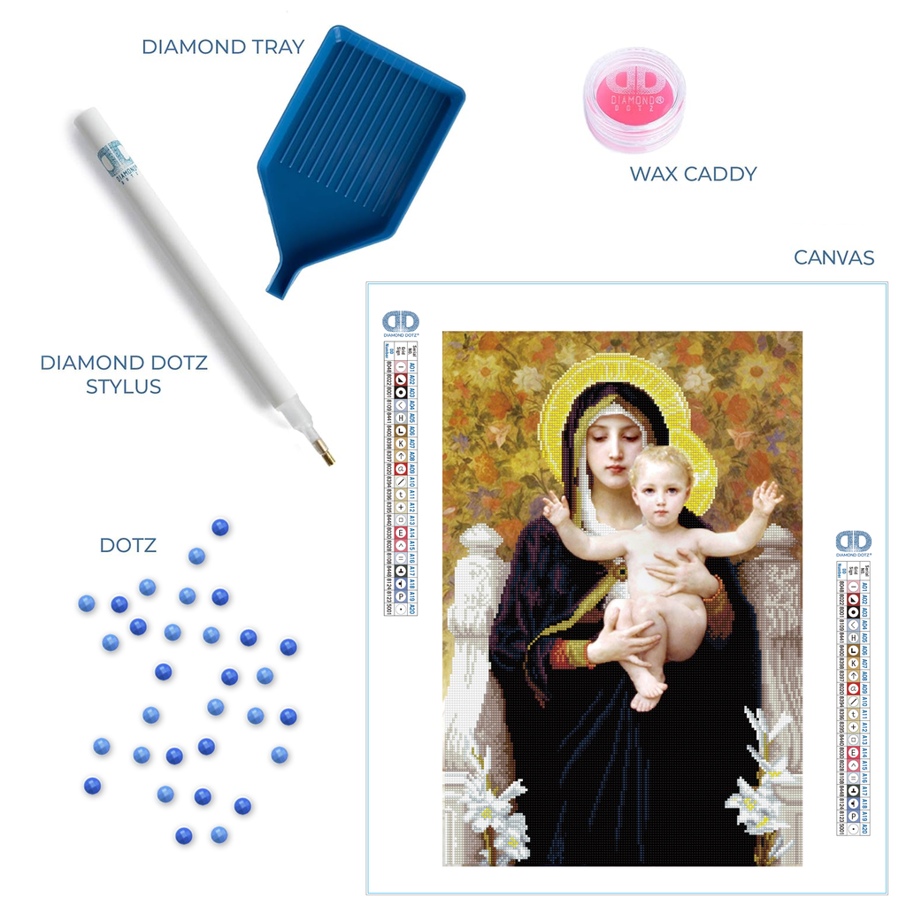 Diamond Dotz La Vierge au Lys (apres William-Adolphe Bouguereay) - 16.5" x 24.4": Inspired by the serene elegance of William-Adolphe Bouguereau’s beloved painting this Diamond Dotz kit captures the gentle beauty of the Virgin and Child surrounded by delicate white lilies. The background features rich warm florals that contrast beautifully with the figures’ soft glowing skin and flowing garments. The golden halo and subtle shading create a sense of divine light making this piece a stunning tribute to classic sacred art. Whether you're a fan of religious iconography or simply drawn to timeless masterpieces this diamond art project offers a peaceful and meaningful creative experience.