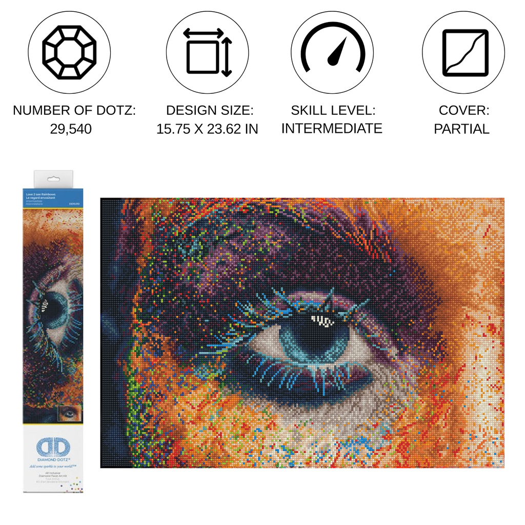 Diamond Dotz Love 2 See Rainbows - 23.6" x 15.8": Let your creativity burst with color in this mesmerizing fantasy diamond painting. Diamond Dotz Love 2 See Rainbows brings bold emotion and stunning detail together in a close-up portrait of an eye surrounded by vivid rainbow hues. Every section of this dazzling image offers a satisfying blend of color shading and artistic flair that will keep you engaged from the first Dotz to the last. Whether you're an experienced crafter or exploring Diamond Art Kits for the first time this kit delivers a deeply rewarding project and a finished piece that’s as impactful as it is beautiful. A perfect addition for fans of Diamond Painting Kits for Adults fantasy diamond painting or dramatic expressive artwork.