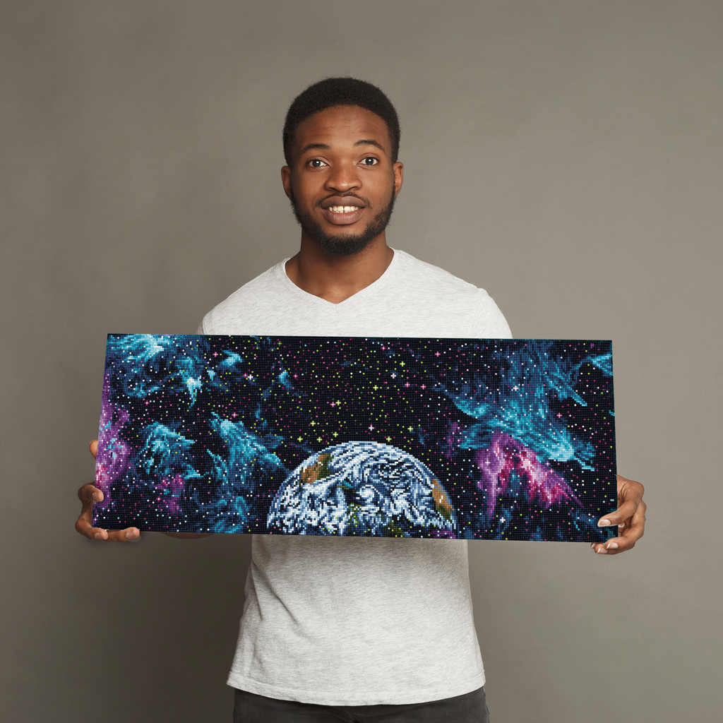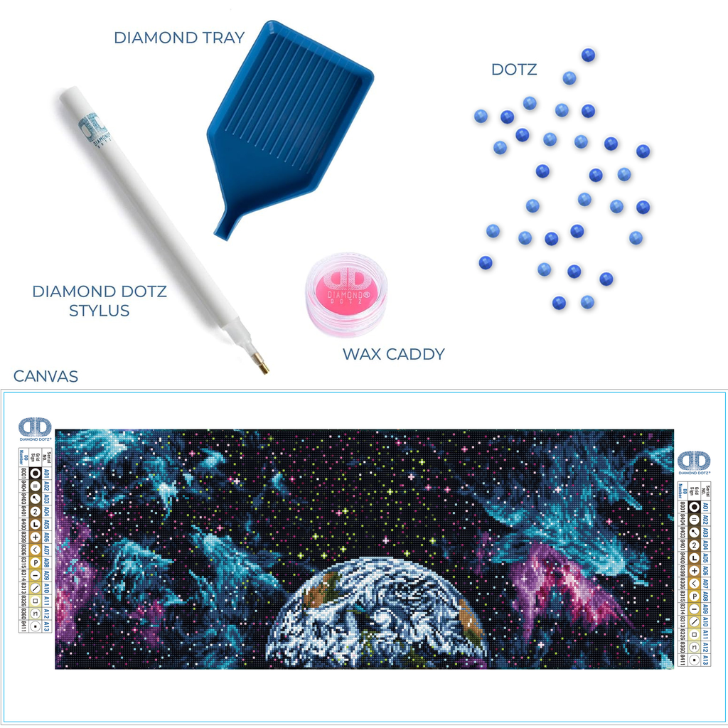 Diamond Dotz Mysterious Universe - 32.3" x 12.6": Journey into the stars with the Diamond Dotz Mysterious Universe kit a dazzling space diamond painting that captures the beauty and mystery of outer space. With swirling galaxies glowing nebulae and a view of Earth from afar this cosmic masterpiece uses round Dotz and full coverage to create a luminous otherworldly effect. Perfect for intermediate crafters and lovers of the cosmos this kit is a stellar addition to your collection of Diamond Painting Kits for Adults and unique diamond art space projects.